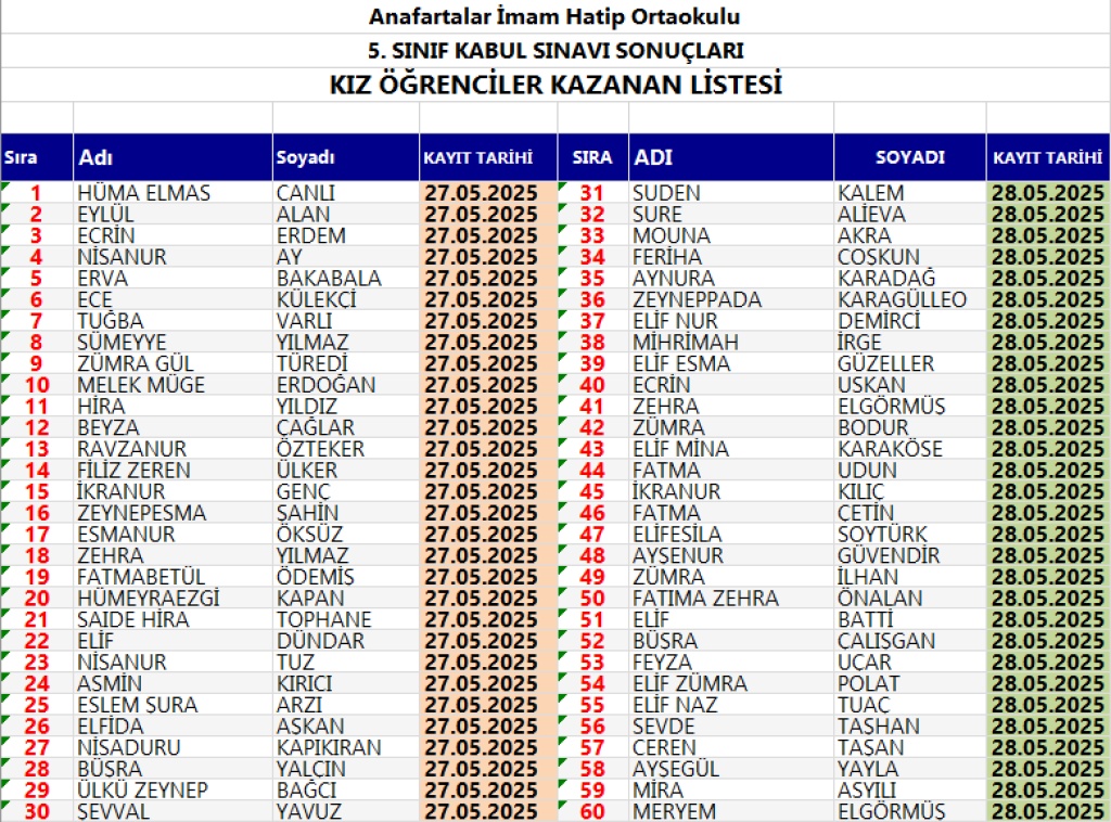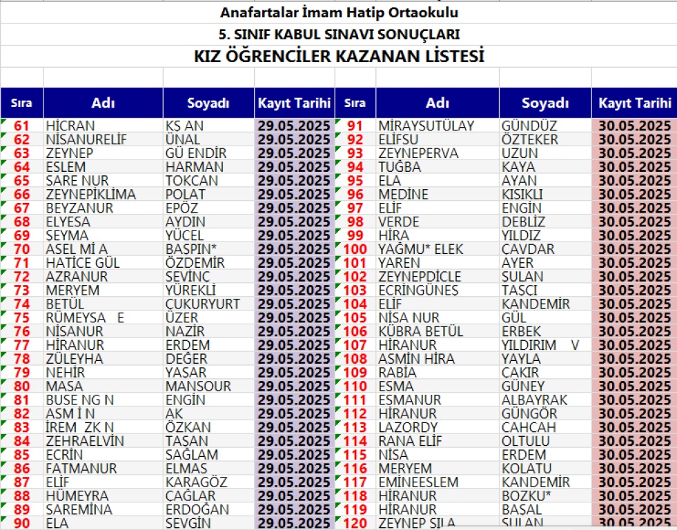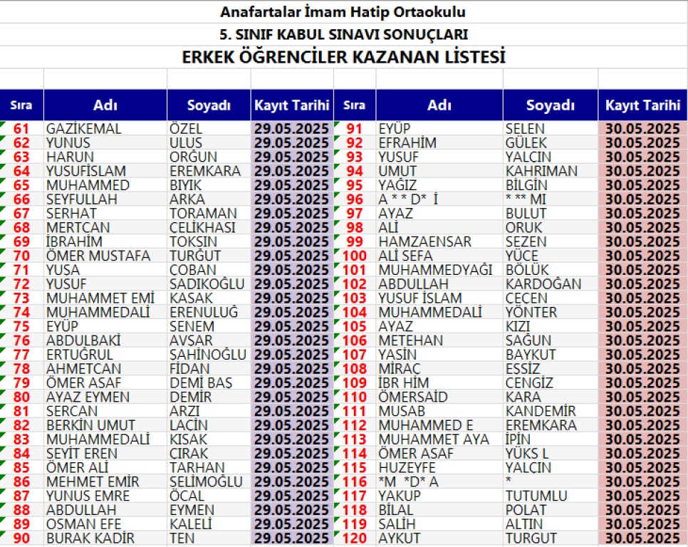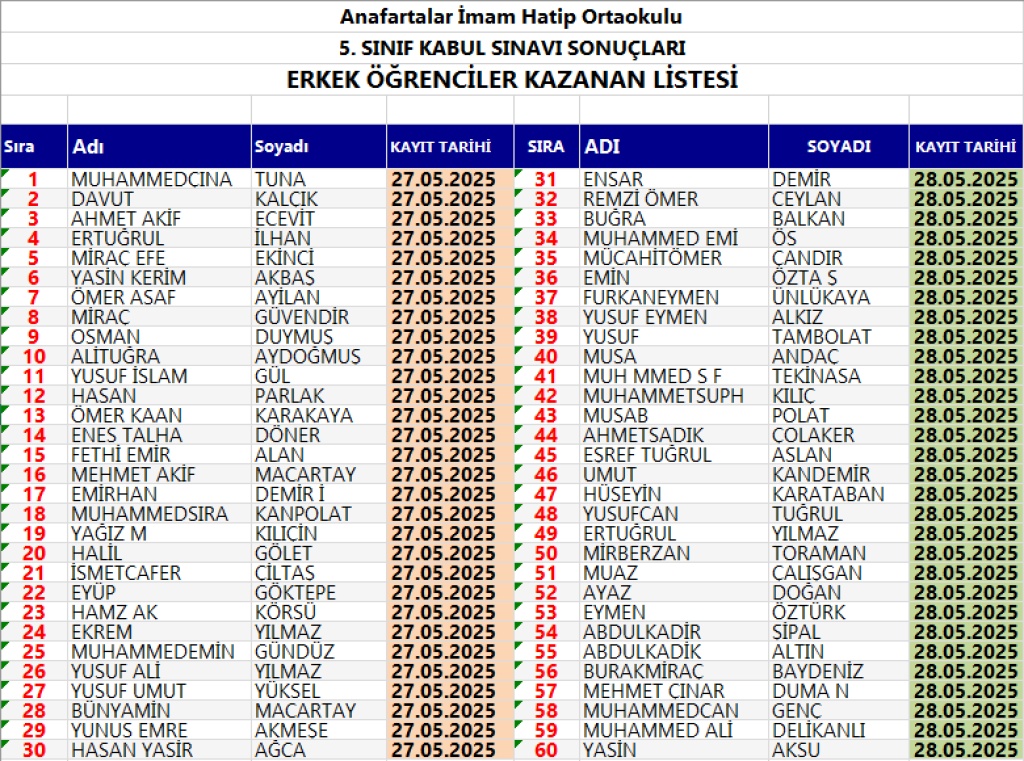 5. Sınıf Kabul Sınavını kazanan öğrencilerimiz listedeki gibidir. İsminizin karşısında yazan tarihte okulumuza gelerek kaydınızı oluşturabilirsiniz.